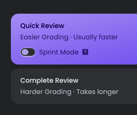 Sprint Mode is a feature that allows you to study much faster. In Sprint Mode, you will only have to get each question right once. You can enable Sprint Mode by clicking on theSprint Mode toggle in the Quick Review session option.